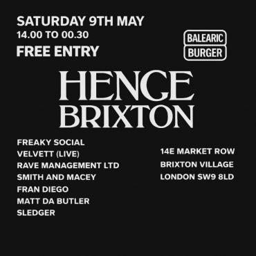 09 May 2026 Henge — Brixton, London Balearic Burger at Henge, Brixton Rave Management Ltd, Charlene From Neighbours, Glen Butler, Freaky Social, Velvett and more... More info
